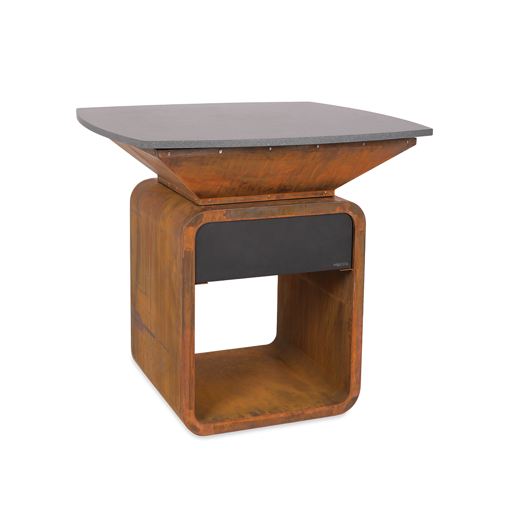 Er kombiniert massiven Cortenstahl mit einer hochwertigen Tischplatte aus Lavastein oder PaperPlank.