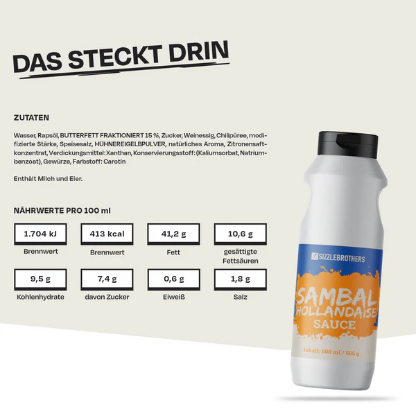 Die Sambal Hollandaise von den SizzleBrothers verbindet feuriges Sambal Oelek mit cremiger, buttriger Hollandaise. Das Ergebnis: eine harmonisch-würzige Sauce mit angenehmer Schärfe – perfekt für Burger, Steaks, Spargel oder Grillgemüse.