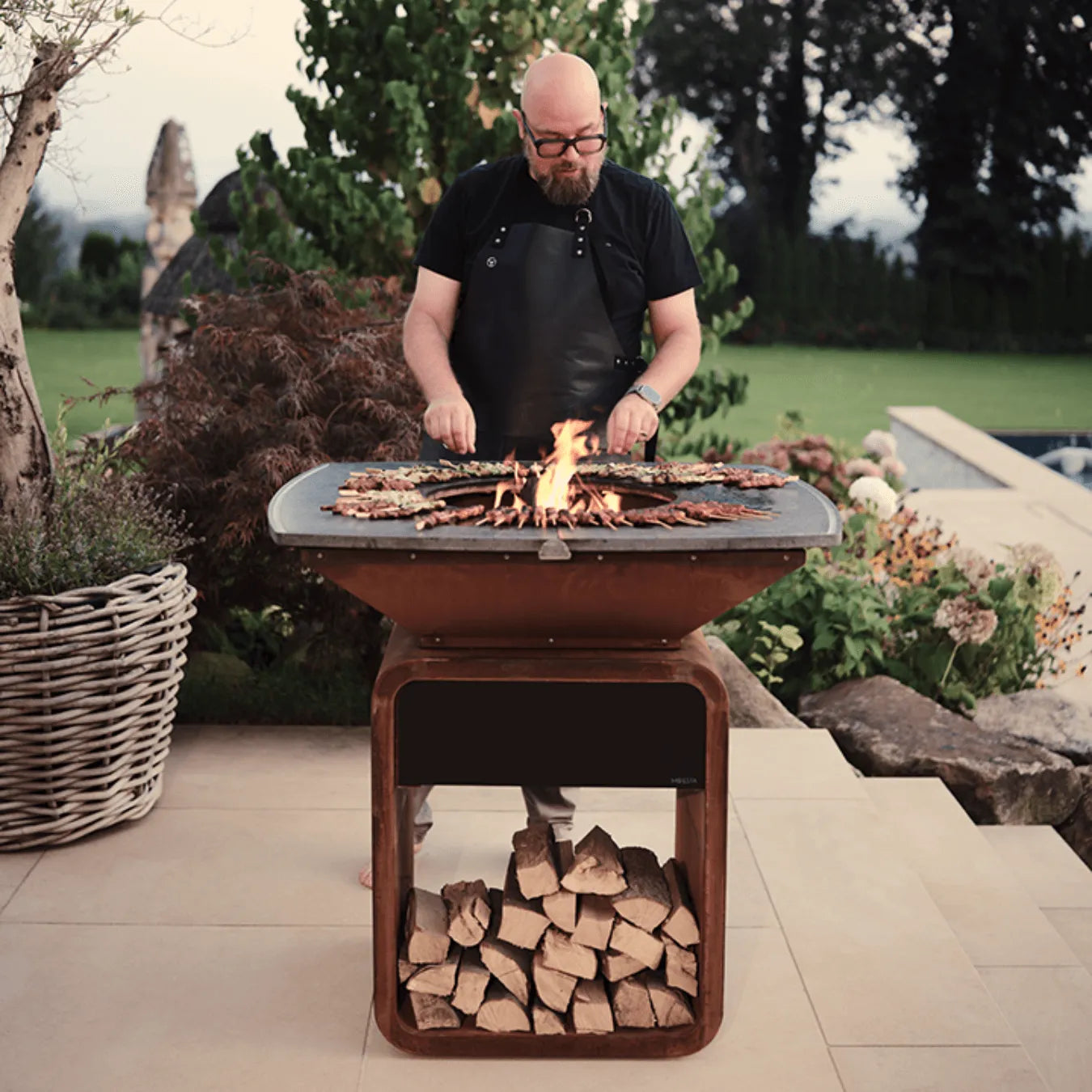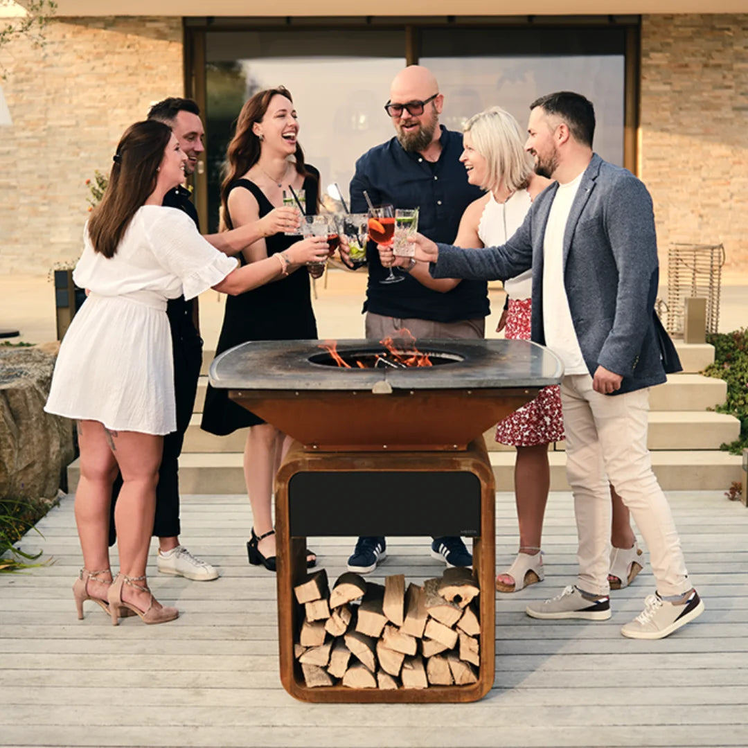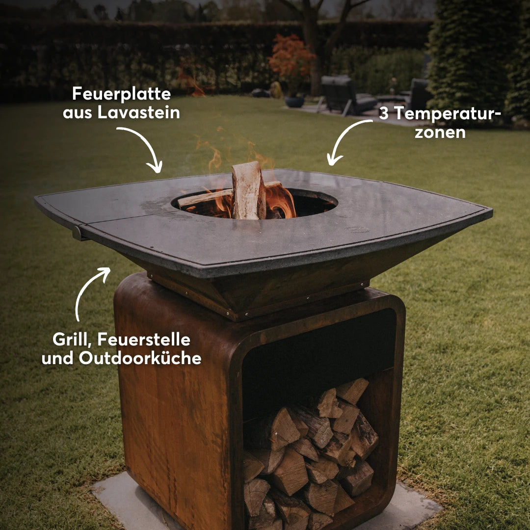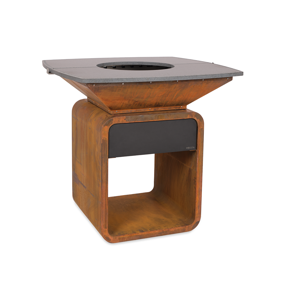 Der Cortenstahl-Korpus ist robust, wetterfest und wird mit der Zeit immer charaktervoller. Er steht stabil im Garten und fügt sich wie ein Designobjekt in deinen Außenbereich ein – nicht wie ein Gerät, das man ständig wegstellen will.