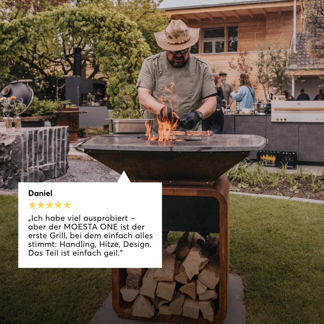Der MOESTA ONE FirePlace ist ein Grill, der deinen Alltag draußen einfacher macht. Die Hitze steht, das Menü läuft und der Abend entsteht ganz von selbst um das Feuer herum. Ob du für zwei kochst oder für eine große Runde – der MOESTA ONE bietet genug Fläche damit alles in deinem Tempo entsteht.