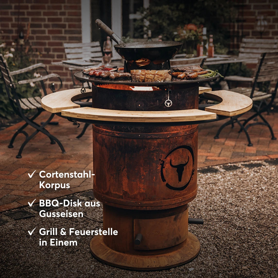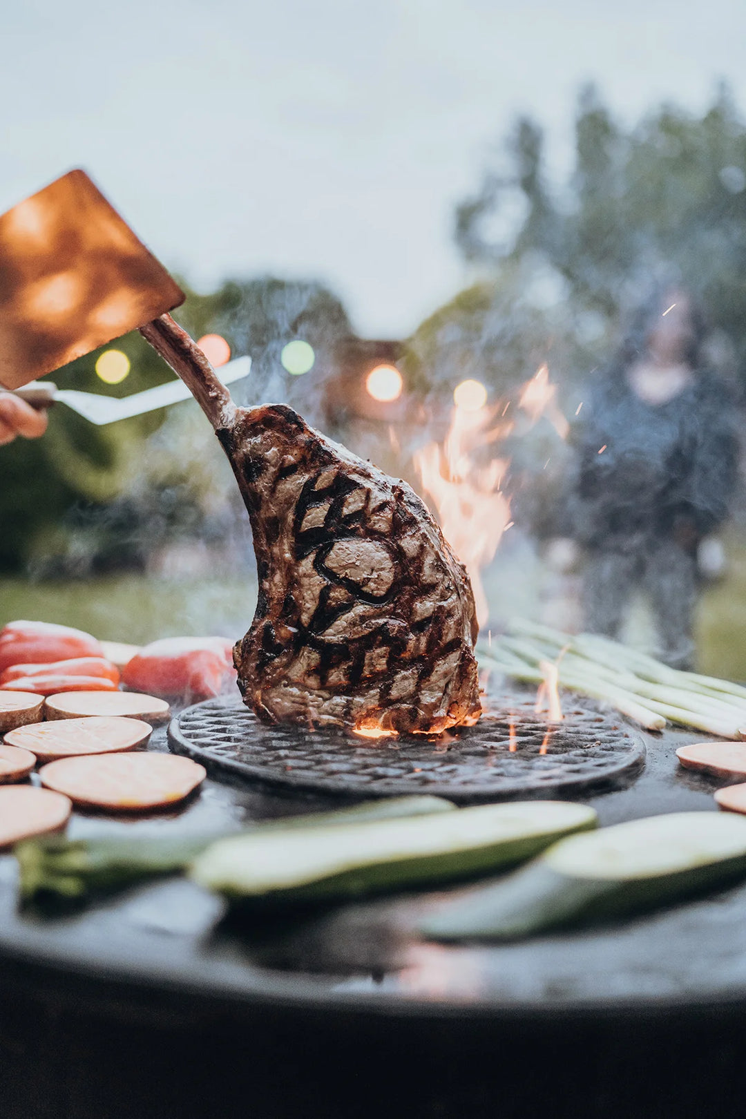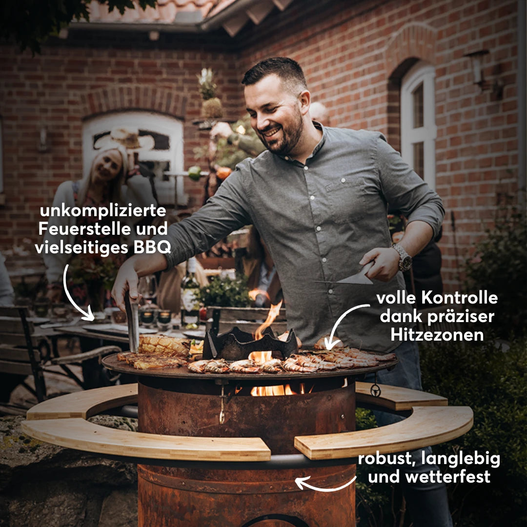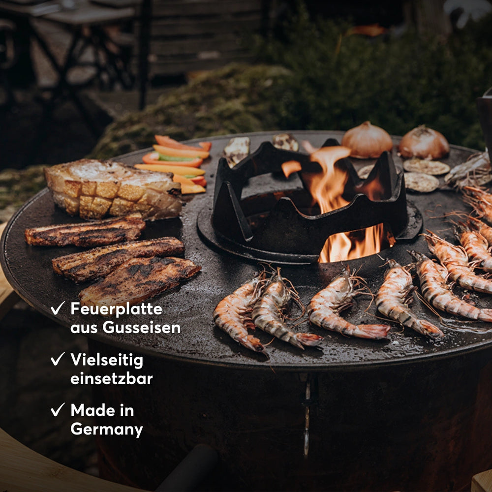 Die massive BBQ Disk aus Gusseisen schafft klare Temperaturzonen – von heiß im Zentrum bis moderat am Rand. Ideal, um verschiedene Speisen gleichzeitig zu garen.