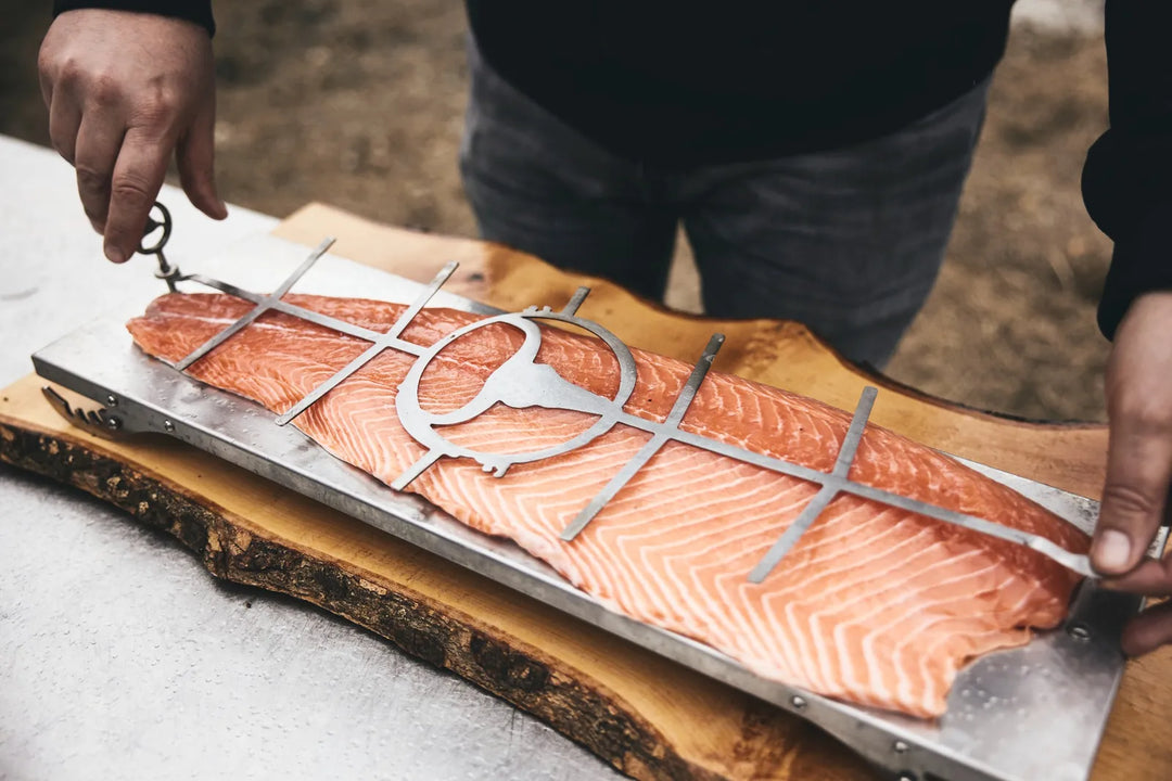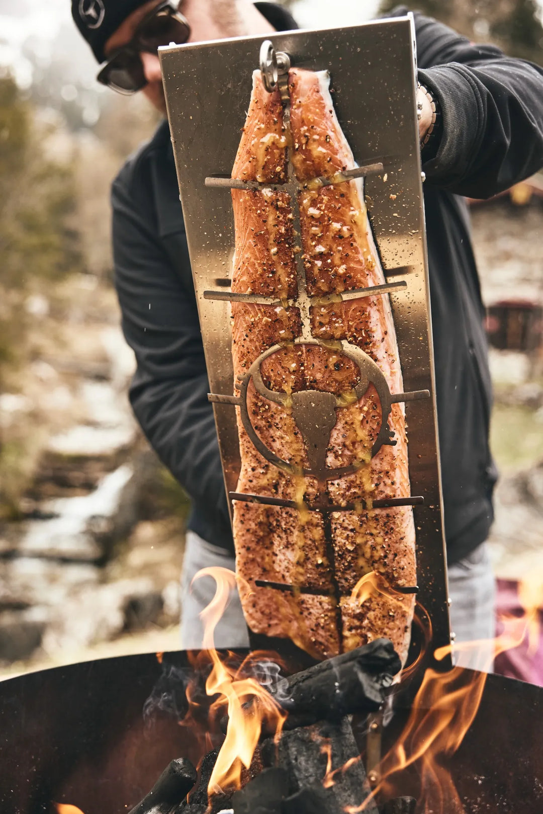 Das BJÖRN Flammlachsbrett ist bereit, wenn du es bist. Kein Einweichen, kein Vorbereiten – einfach einspannen, ausrichten, losgrillen. Ganze Lachsseiten gelingen zuverlässig über offener Flamme – direkt an der Feuerschale, am Bandit FirePlace oder am Kugelgrill.